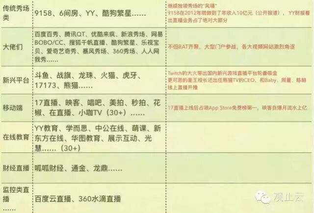 先来说说互动直播到底是不是真火?是真火,加一个程度的话,那就是令人咋舌。虽然目前还未看到有第三方对这个行业的精准分析报告,但我们可以从一些例子侧面去体会它的火爆程度。先给一张观止云市场研究部门给出的中国互动直播大版图(部分):