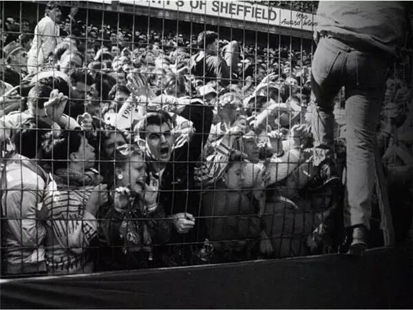 1989年4月15日于英国希尔斯堡球场发生人群踩踏事件,史称“希尔斯堡惨剧”(Hillsborough Disaster),当时是英格兰足总杯准决赛的其中一场,由于球场场地限制及入场人群过量并失控的关系,导致人群推挤踩踏,造成96人死亡,766人受伤。画面中的铁丝网设于看台与球场之间,由于当时英国常有“足球流氓”擅闯场区或扔杂物到比赛场上,所以大部分球场都会架设这样的铁丝网。