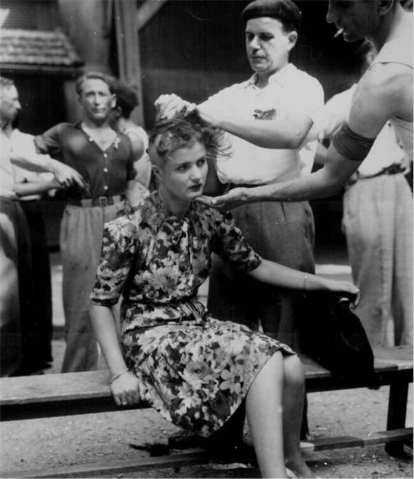 二战结束后,法国光复,在欢庆胜利的同时,他们也把复仇之愤发泄到曾经丧失气节与德国军人谈恋爱的女人身上:把她们剃光了头,剥光内衣裤,身上涂满焦油,行纳粹礼。图片为一名法国女人被民众当街剃光头,作为她勾引德国军队的惩罚。