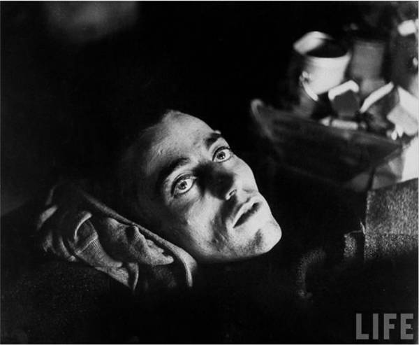 一位消瘦的美国战俘在德国被释放之后,躺在窄床上的特写。1945年,二战结束,同盟国要求德国释放战俘。