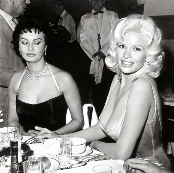 1957年4月12日,在一个派对上,简·曼斯菲尔德展示自己的乳沟,与她坐在一起的索菲娅·罗兰正盯着她的胸部。