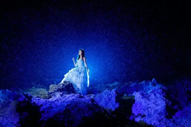 例如上图是在冲绳拍摄,先在模特儿后方,放一支Nissin MG8000 配蓝色滤片打出蓝光,也放一支相同的照亮前景,然后再加一个环形闪及MG8000 作主光源,配橙色滤片照亮主体︰