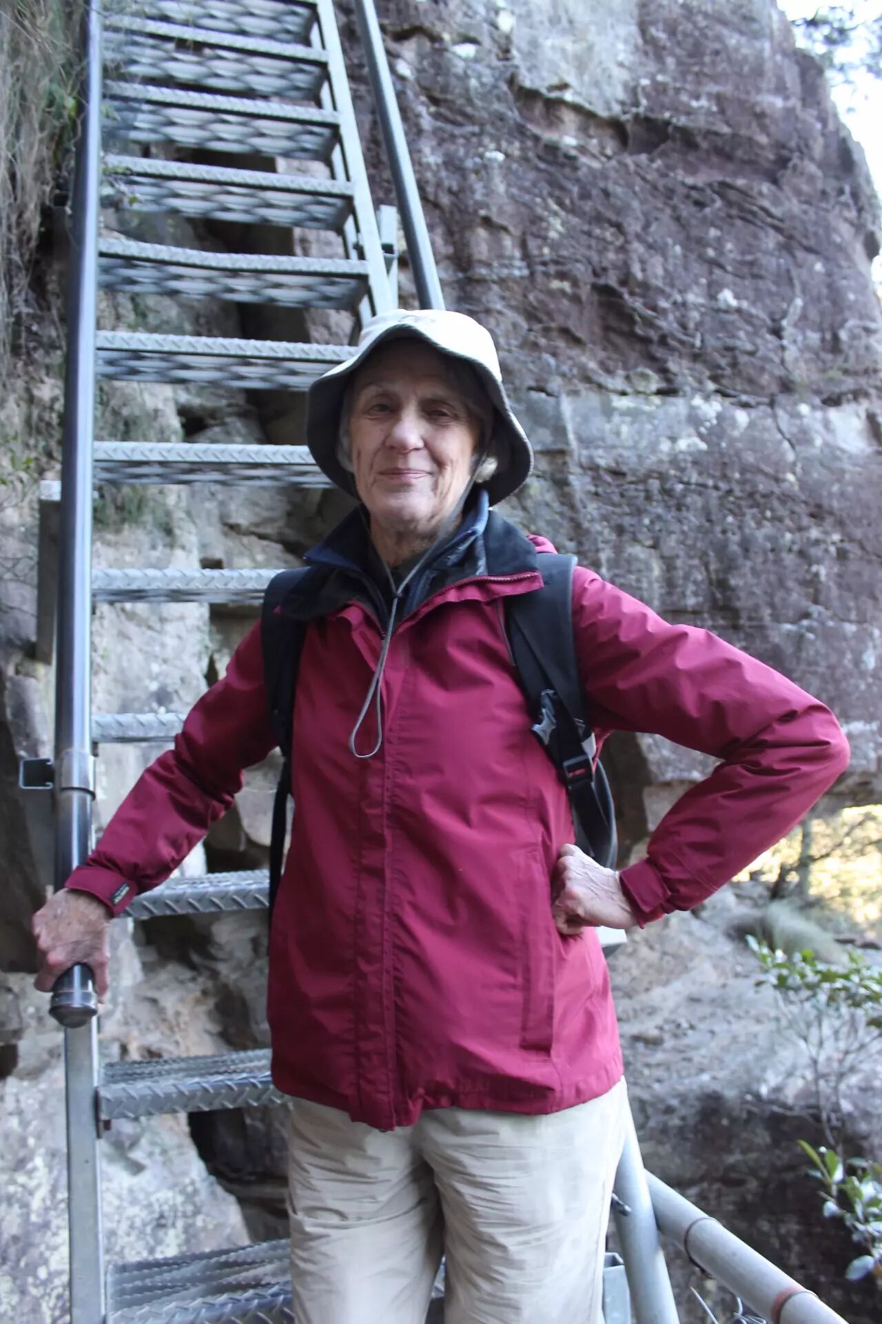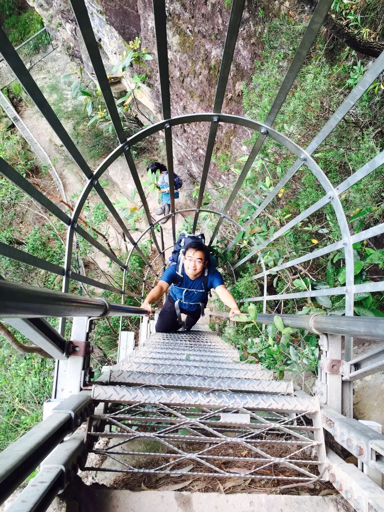 Wentworth Pass的趣味性要远远高于National Pass。挤过这道坎儿,再往下的路要顺着“铁皮管子”(领队的戏称)倒过来走,脚下是镂空的台阶,眼前更是深不可测的悬崖。这时候,往往会有一群群的葵花鹦鹉在空中嬉戏,不过仔细听,能听出来它们唱的这出是“逐客令”。