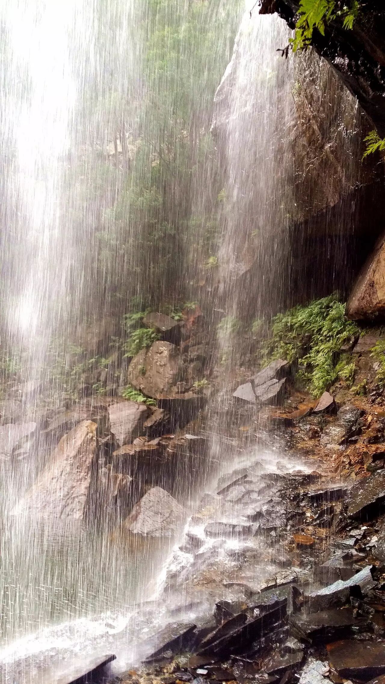 从百阶天梯下到半山腰处,便可自下往上欣赏打趣这深山天瀑了。
