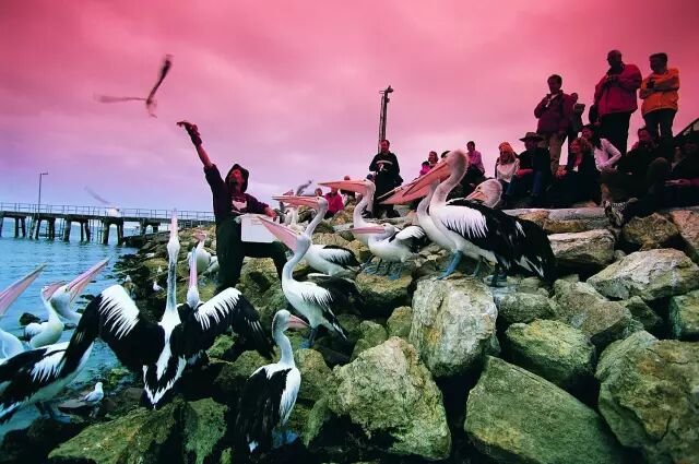 每天下午的5点钟,在金斯科特Kingscote的栈桥附近都有喂鹈鹕的表演,这也是游人不可错过的一站。游客可以在这里近距离的接触到鹈鹕。有“鹈鹕大叔”之称的John Ayliff数十年来每天都会在固定时间提着满满一大桶鱼出现在这里,就连圣诞节都没有缺席,而成片的鹈鹕也会提前聚集于此,成群来抢食。在表演的同时,John也会为大家讲解鹈鹕和其它海鸟的知识。