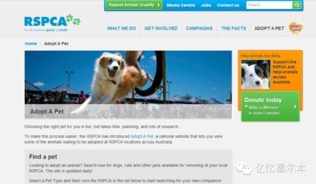 http://www.rspca.org.au/adopt-pet 在这个网站上,可以选择领养宠物,这些宠物多半是走失或者被遗弃的宠物。